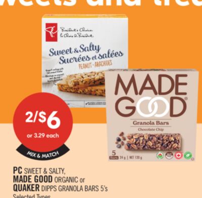 PC SWEET & SALTY, MADE GOOD ORGANIC or QUAKER DIPPS GRANOLA BARS 5's