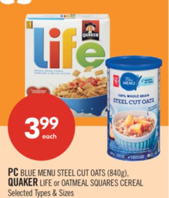 PC BLUE MENU STEEL CUT OATS (840g). QUAKER LIFE or OATMEAL SQUARES CEREAL