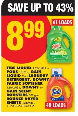 TIDE LIQUID 1.62/1.86 L OR PODS 18/31' S, 48 LOADS GAIN LIQUID 2.6 L LAUNDRY DETERGENT, 61 LOADS DOWNY FABRIC SOFTENER 1.66/2.63 L, DOWNY OR GAIN SCENT BOOSTERS 379 G OR BOUNCE DRYER SHEETS 120/200' S