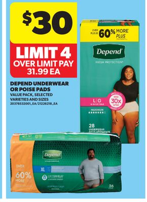 Score big savings on DEPEND UNDERWEAR OR POISE PADS! Real Canadian Superstore is offering this general essential at on sale. That's 0 back in your pocket. Popular with Canadian buyers.