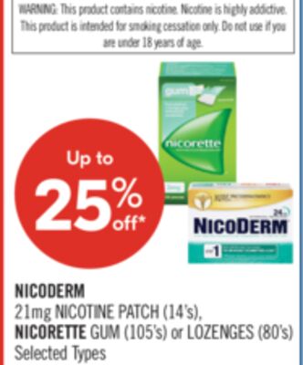 NICODERM 21mg NICOTINE PATCH (14's), NICORETTE GUM (105's) or LOZENGES (80's)