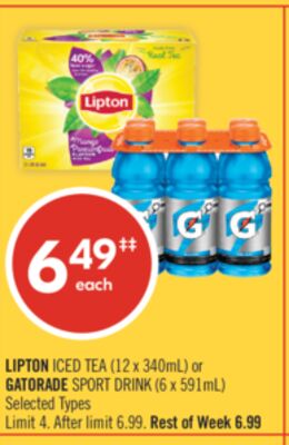 LIPTON ICED TEA (12 x 340mL) or GATORADE SPORT DRINK (6 x 591mL)