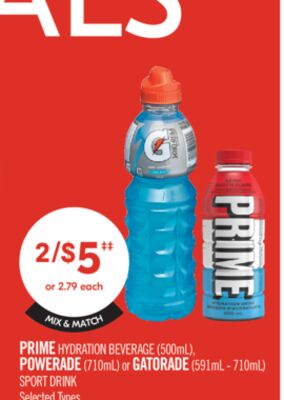 PRIME HYDRATION BEVERAGE (500mL), POWERADE (710mL) or GATORADE (591mL - 710ml) SPORT DRINK