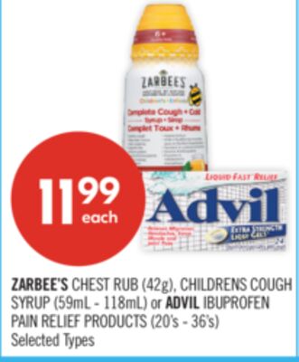 ZARBEE'S CHEST RUB (42g). CHILDRENS COUGH SYRUP (59ml - 118ml) or ADVIL IBUPROFEN PAIN RELIEF PRODUCTS (20's - 363)