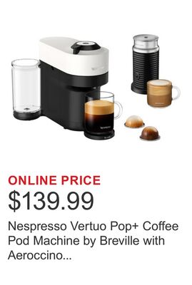 Our Canadian shopping experts found this incredible deal on Nespresso Vertuo Pop+ Deluxe Coffee and Espresso Machine by Breville with Aeroccino with $25 Nespresso Coffee Credit, Matte Black and Gold at Costco. Originally priced at 0.00, you can now get it for just 139.99, saving you 0. Don't miss this Canadian deal. Selling quickly - grab yours now.