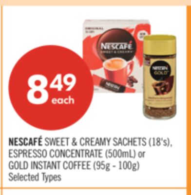 NESCAFÉ SWEET & CREAMY SACHETS (18's), ESPRESSO CONCENTRATE (500mL) or GOLD INSTANT COFFEE (95g - 100g)