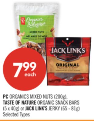 PC ORGANICS MIXED NUTS (200g), TASTE OF NATURE ORGANIC SNACK BARS (5x40g) or JACK LINK'S JERKY (65-81g)