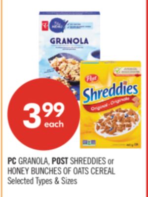 PC GRANOLA, POST SHREDDIES or HONEY BUNCHES OF OATS CEREAL