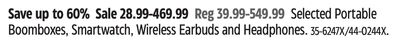 Selected Portable Boomboxes, Smartwatch, Wireless Earbuds and Headphones.