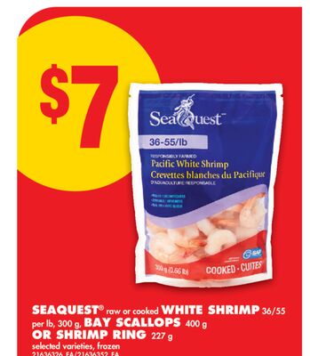 SEAQUEST® RAW OR COOKED WHITE SHRIMP, 36/55 PER LB, 300 G, BAY SCALLOPS, 400 G OR SHRIMP RING, 227 G