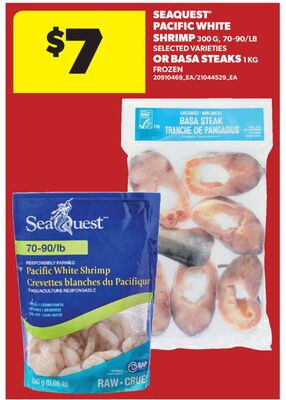 SEAQUEST® PACIFIC WHITE SHRIMP, 300 G, 70-90/LB SELECTED VARIETIES OR BASA STEAKS, 1 KG FROZEN
